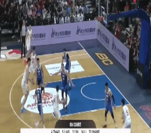 第一节末段,双方打的十分胶着,廖三宁、高诗岩连续上场强突。——廖三宁上到篮下后,传球给到朱俊龙,后者远投三分命中。漂亮!
