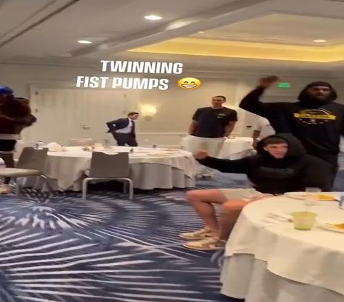 海斯和范德比尔特站在东契奇一旁,像两大护法一般,拉拉东契奇的帽子,拍拍他的肩膀,欺负人!