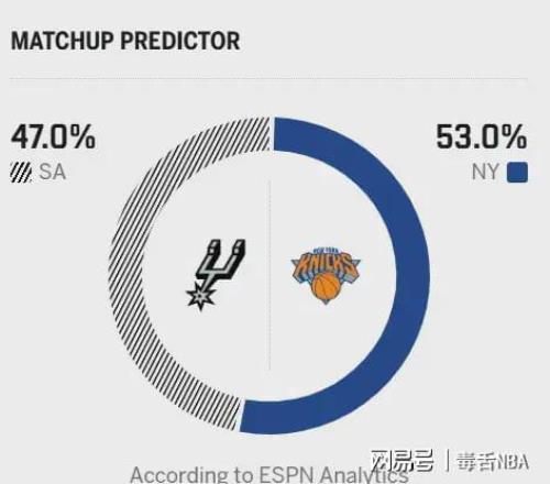反观尼克斯,上一场以127-98大胜雄鹿,近期整体发挥平稳。输球场次里,仅一场不敌步行者,另外三场分别负于活塞(两场)和骑士;赢球名单中则包括火箭、凯尔特人等强队。球队进攻依旧围绕布伦森展开,今天对阵马刺,能否赢下这场硬仗,关键要看布伦森和唐斯的发挥。赛前,美媒ESPN预测本场比赛,马刺胜率47.0%,尼克斯胜率53.0%!