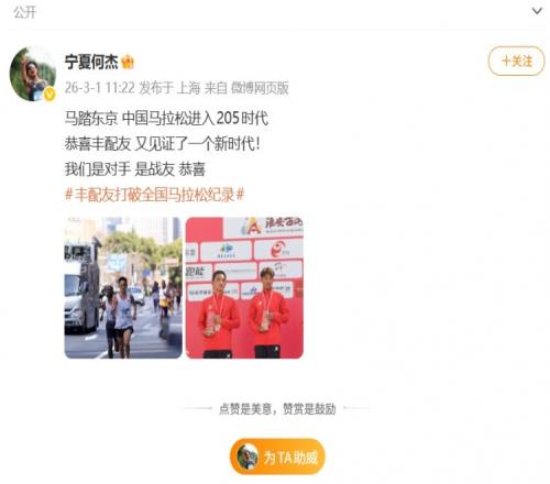 原纪录保持者何杰更新社媒,为丰配友送上祝福。何杰写道:马踏东京 中国马拉松进入205时代 恭喜丰配友 又见证了一个新时代!我们是对手 是战友 恭喜。