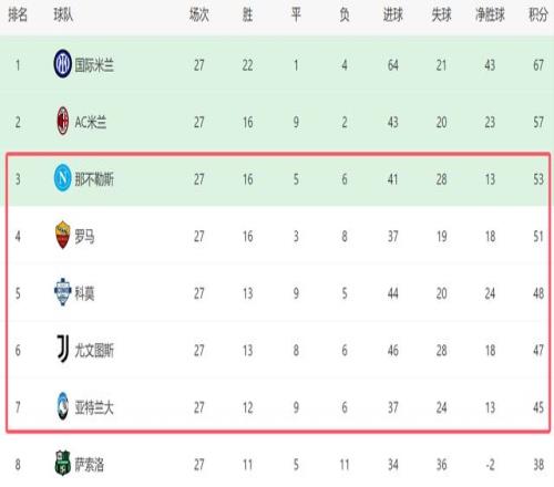 在这一夜,除了罗马和尤文战平之外,亚特兰大也没能拿到3分,他们在客场1-2输给了萨索洛,无缘取得4连胜。由于意甲3强连续不胜,争四的格局也更加混乱。截至目前,从第三的那不勒斯,到第七的亚特兰大,这5支球队就差了8分,他们当中最后很可能只有2队能拿到欧冠席位。尽管那不勒斯和罗马现在有积分优势,但是身后的对手都对前四虎视眈眈,在最后的11轮比赛中,还有很大的变数。