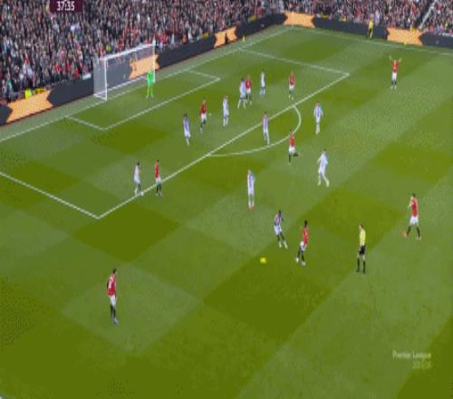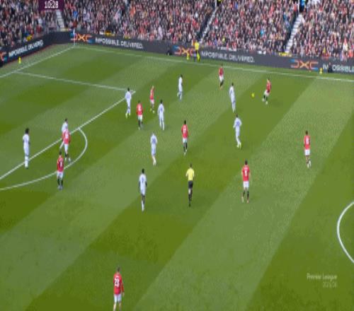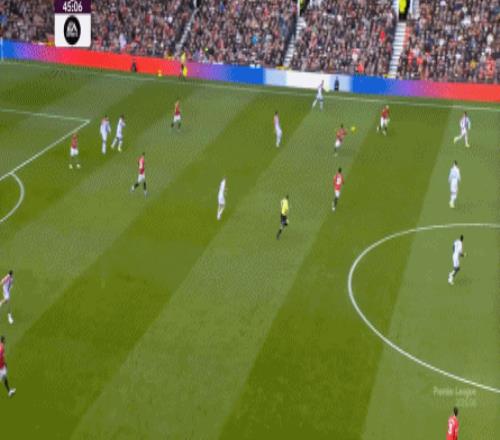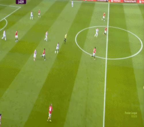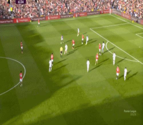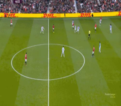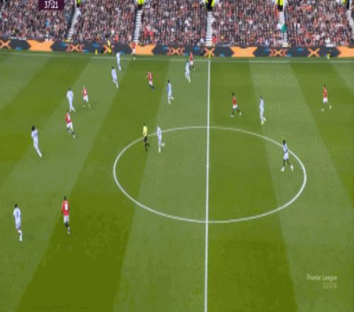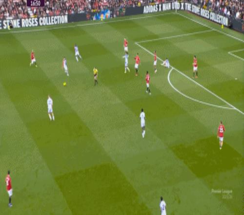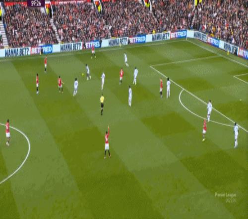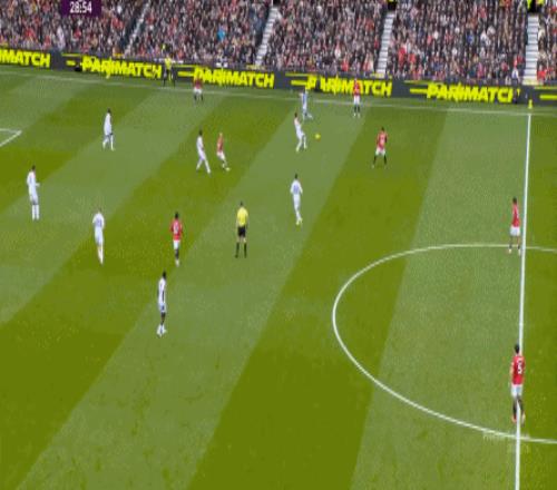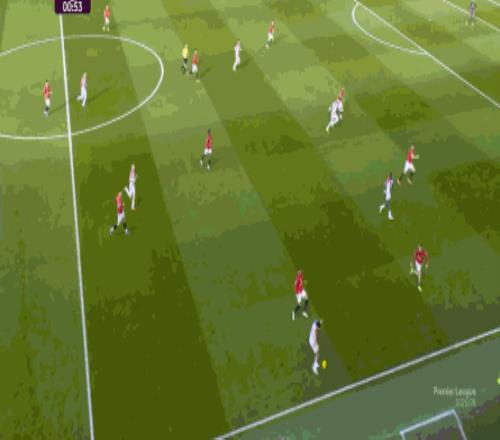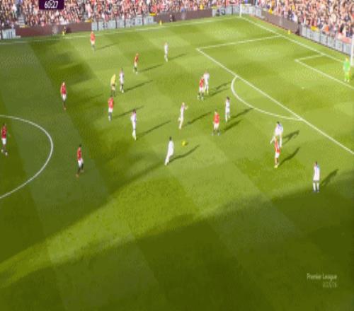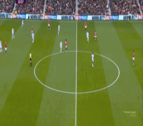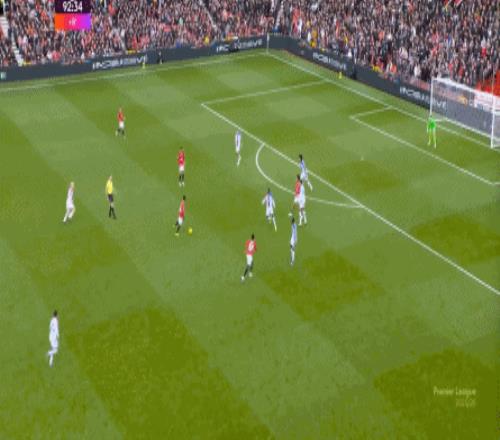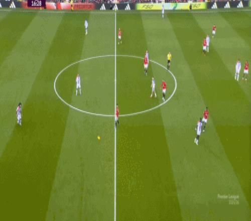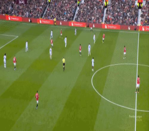 在这场比赛之前,曼联的进攻思路是充分拉高跑动量,让前场四人自由换位,甚至形成某个半扇或局部的集聚态势,这场比赛也不是没有这样的例子,就像第11分钟,库尼亚便来到右路,和姆贝乌莫形成一前一后的站位,从而在右路送上传中: