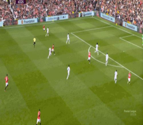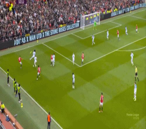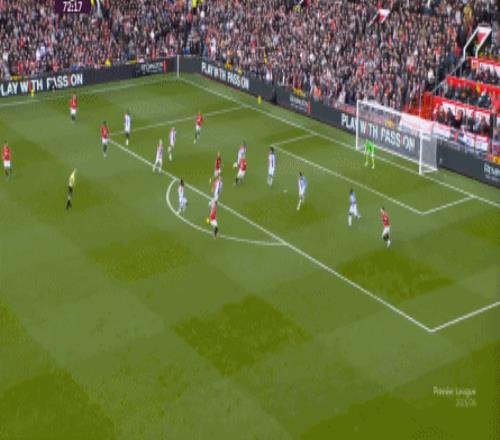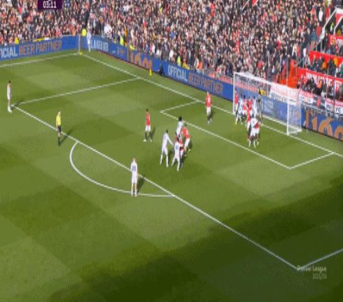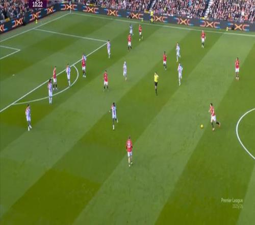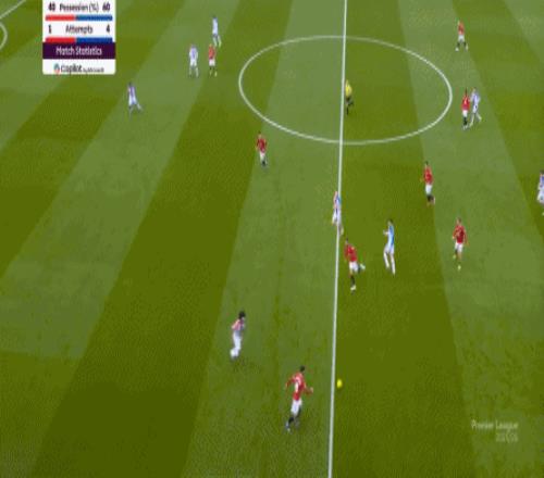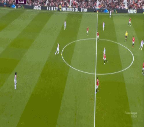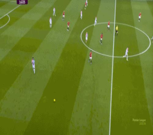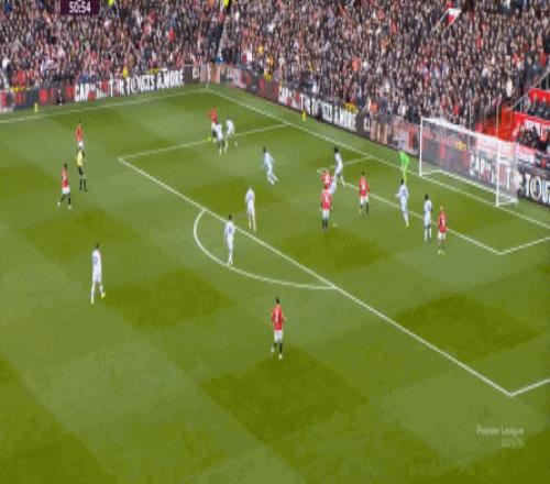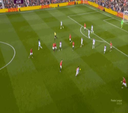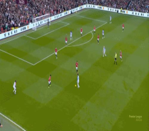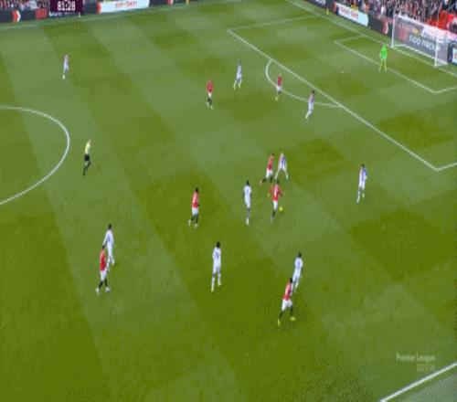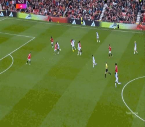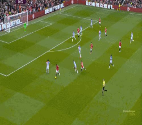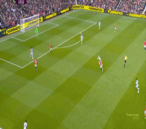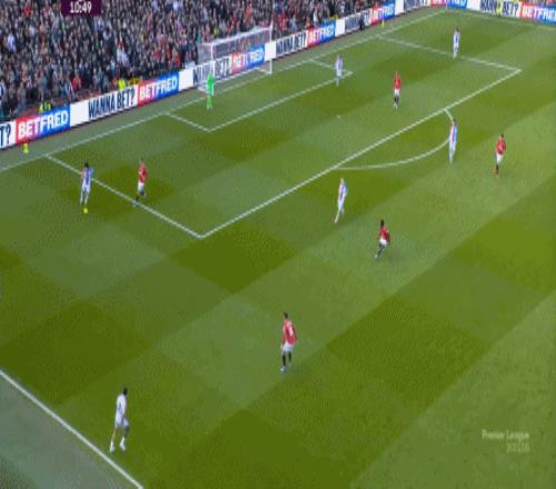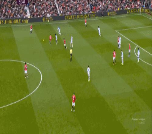 在这场比赛之前,曼联的进攻思路是充分拉高跑动量,让前场四人自由换位,甚至形成某个半扇或局部的集聚态势,这场比赛也不是没有这样的例子,就像第11分钟,库尼亚便来到右路,和姆贝乌莫形成一前一后的站位,从而在右路送上传中: