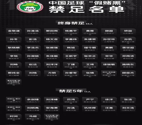 今年1月29日,足协又公布了第2批涉案人员的处罚,76人被罚,陈戌源、杜兆才、李铁、王小平、郝伟、张鹭、秦升等73人终身禁足。