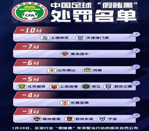 不仅如此,新赛季共有包括9支中超队在内的13支职业队被罚分,其中天津津门虎、上海申花被罚10分,泰山被罚6分,海港和国安被扣5分,这也给这几支中超老牌劲旅的新赛季征程蒙上阴影。